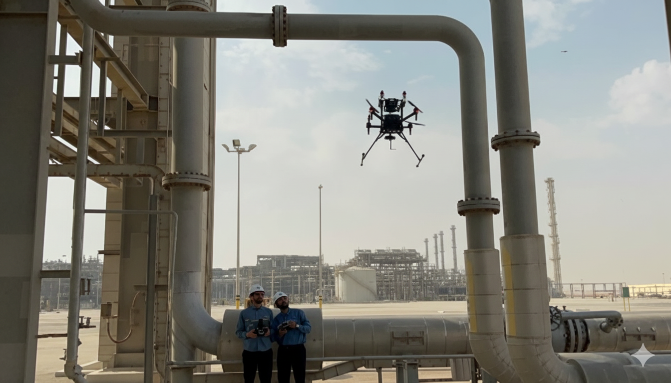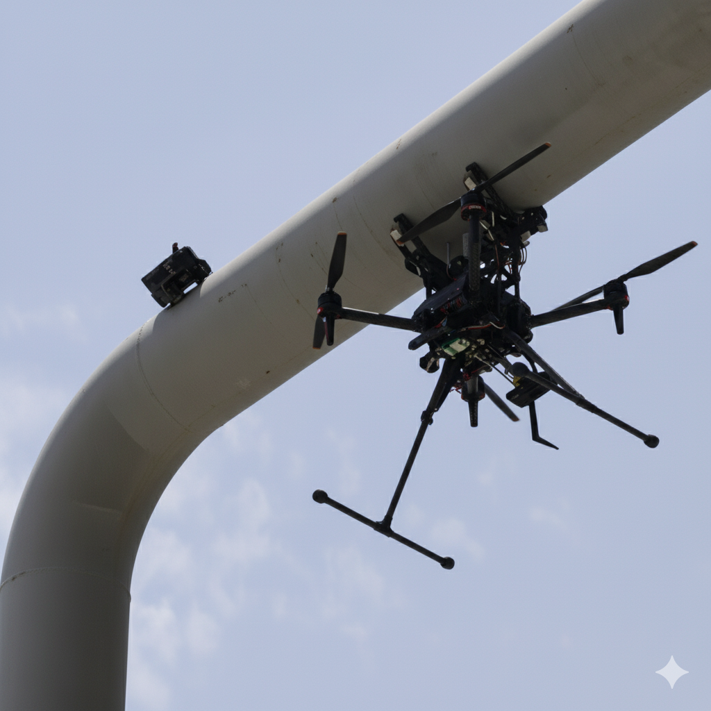 Periodic non-destructive testing (NDT) of pipes and tanks helps detect corrosion before leaks or shutdowns. A hybrid UAV–crawler system enables detailed inspection of elevated pipes without scaffolding, enhancing safety and reducing costs. The UAV perches to save energy, deploys a magnetic-wheeled crawler with ultrasonic sensors for wall-thickness scans, and retrieves it to inspect other pipes as small as 8 inches.